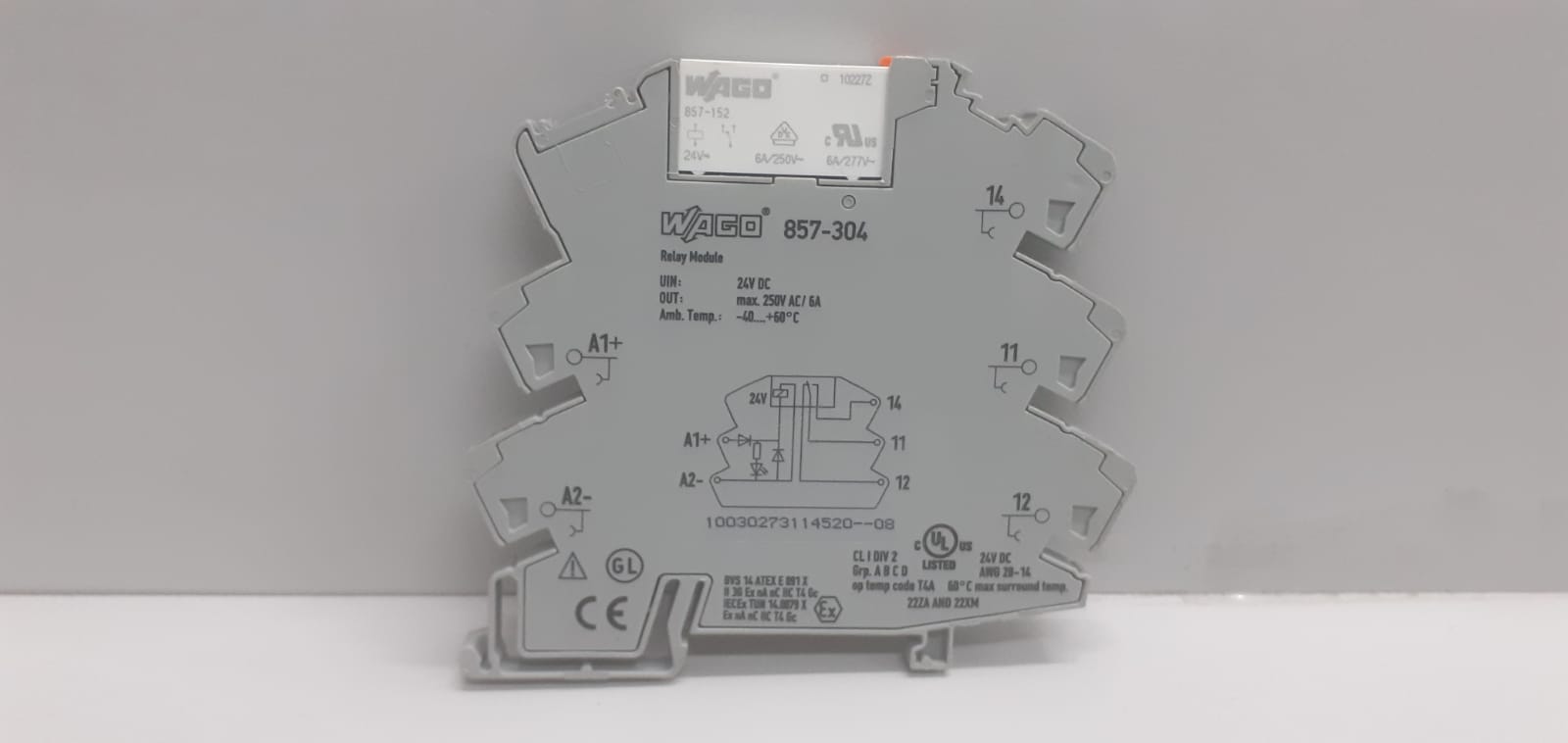 857-304 Módulo de relés; Tensão de entrada nominal: 24 VDC; 1 contato reversível; Corrente contínua de limite: 6 A; Indicador de status amarelo; Largura do módulo: 6 mm; 2,50 mm²; cinza